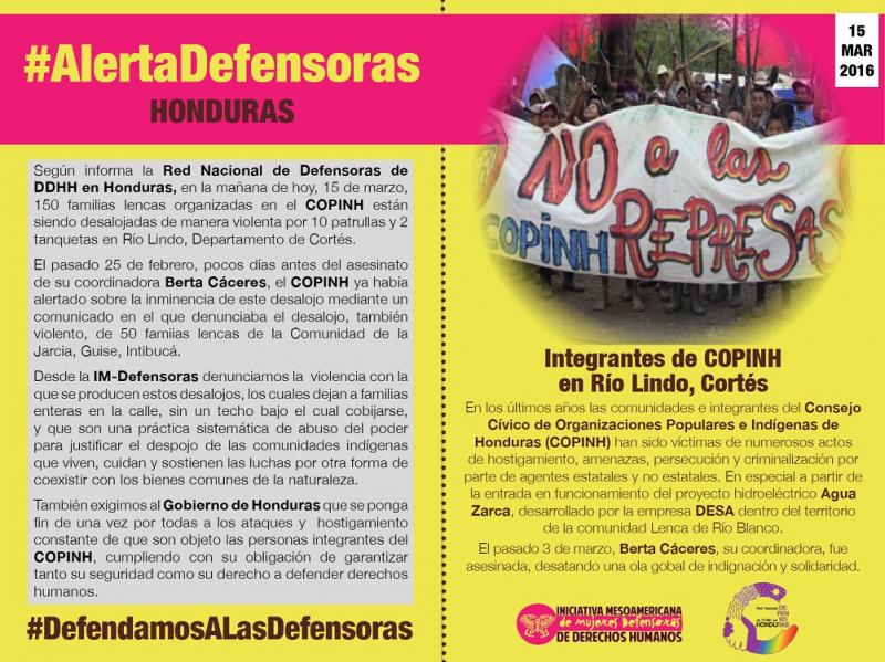 Mesoamérica, 17 de marzo de 2016 - Las 691 mujeres defensoras de derechos humanos de El Salvador, Guatemala, Honduras, México y Nicaragua que integramos la Iniciativa Mesoamericana de Mujeres Defensoras de Derechos Humanos demandamos al gobierno de Honduras cumpla de manera inmediata con su obligación de proteger la vida y la integridad de las defensoras de derechos humanos.