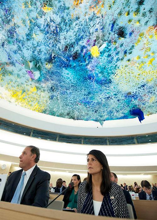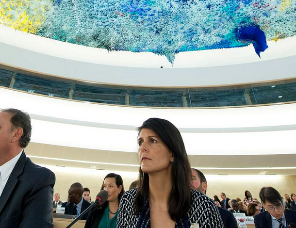 L’ambassadeur des États-Unis aux Nations Unies, Nikki Haley, a décrit le Conseil comme étant une « latrine » de partialité, empreinte d'hypocrisie et d'intéressement. Elle a affirmé qu’elle accordait trop d’attention à Israël et pas suffisamment à l’Iran, et - enjeu clé - que trop peu de gouvernements étaient d’accord avec les propositions des États-Unis sur la réforme de l’ONU.