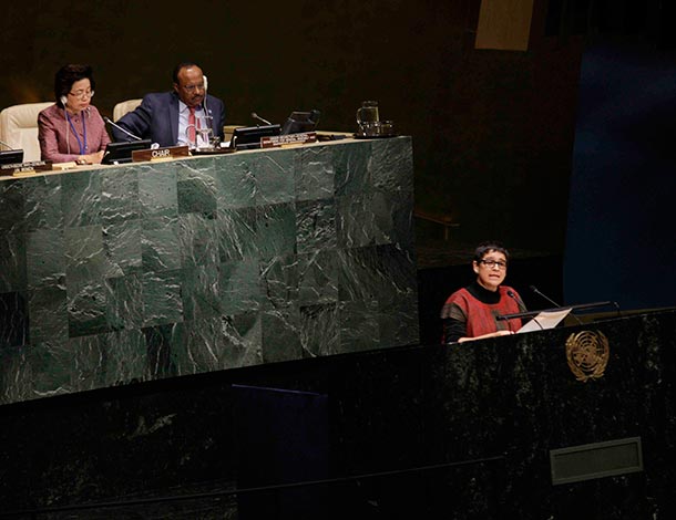 Cinquièmement, le texte de la Déclaration politique est faible et ne va pas assez loin pour encadrer les changements transformateurs essentiels pour réaliser l'égalité de genre. Nous, les femmes du monde, femmes unies par delà notre diversité, nous méritons beaucoup mieux que cela. Nous méritons que vous mettiez de côté vos différences idéologiques, politiques et religieuses afin de reconnaître pleinement et d’affirmer les droits fondamentaux des femmes et des filles et la justice de genre. Rien de moins. Nous avons besoin de la pleine réaffirmation de la Plateforme d'action de Beijing, mais également d’un engagement fort pour garantir ceci: