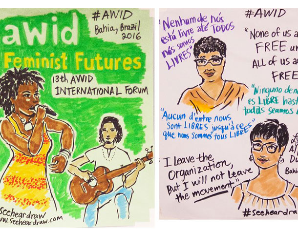 Le Forum de l'AWID se capture avec des mots, des photos et des illustrations. Les images ci-dessous ont été réalisées par Tracey et Liz de SeeHearDraw. Elles interprètent en illustration le riche contenu partagé par nos contributeurs-trices et les participant-e-s lors des séances plénières et différentes discussions du Forum.