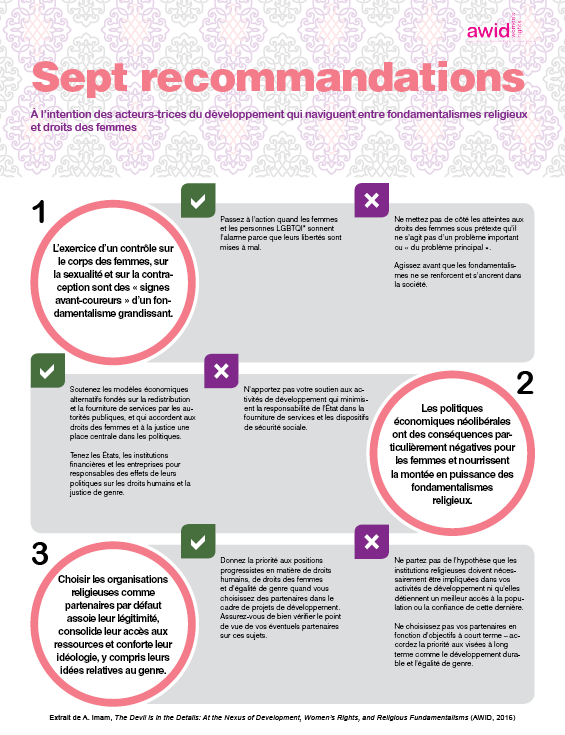 Cet aperçu est adapté de la publication de l’AWID intitulée « Le Diable est dans les détails : le lien entre le développement, les droits humains des femmes et les fondamentalismes religieux » (Ayesha Imam, 2016).