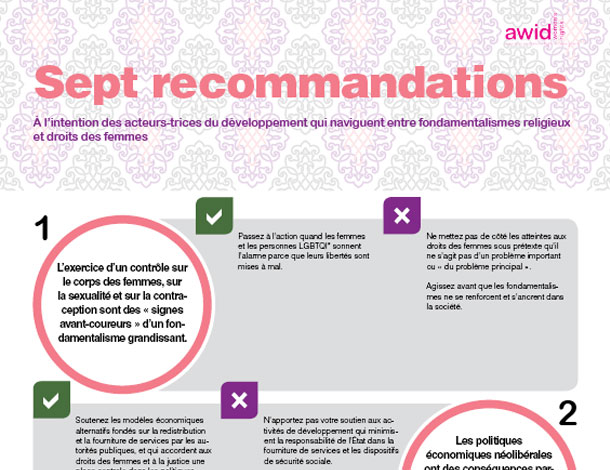 Cet aperçu de deux pages suggère des moyens concrets que les acteurs et actrices du développement peuvent mettre en pratique pour éviter de renforcer les groupes et idéologies religieuses fondamentalistes. Il suggère également de s’attaquer à ce problème par le biais d’une collaboration entre les acteurs du développement et les mouvements de droits humains des femmes.