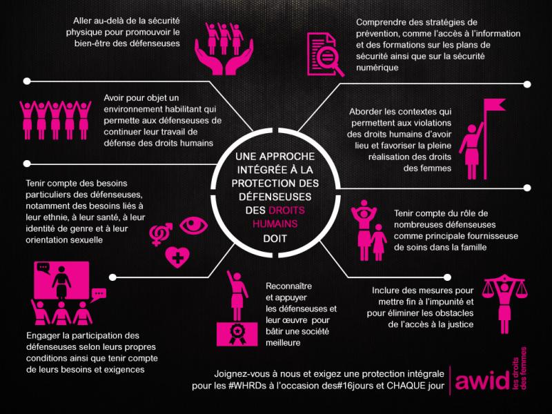 Cet ensemble de supports graphiques mettent en exergue des composants clés d’une protection intégrale pour les défenseuses des droits humains. Joignez-nous en partageant ces supports graphiques et en attirant l'attention sur la nécessité de fournir une protection intégrale pour les défenseuses des droits humains !