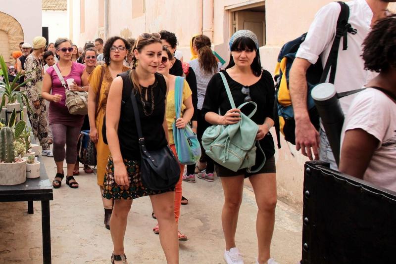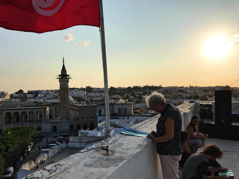 Jalila Baccar, one of the jury members, looks over the festival program on the roof of the Tunisian National Theater (palace Halfaouine). Each day of the festival brought together a diverse mix of people from artistic and cultural spheres and people from the local neighborhood of Medina. The roof was also the place where the percussion workshop was held, in which several local residents participated. Overheard, two elderly men talking to a festival organizer: