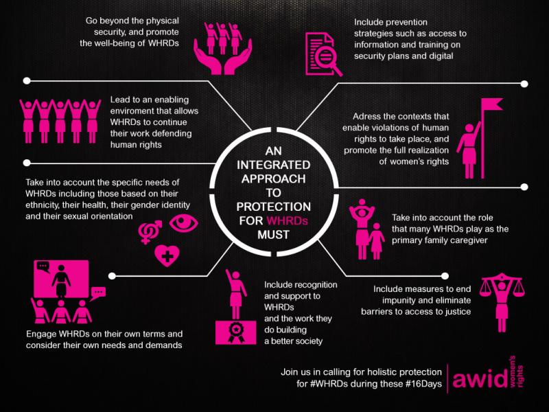 This set of infographics share key components of holistic protection for women human rights defenders (WHRDs). Download and share these graphics and help bring attention to the need to provide holistic protection for WHRDs.