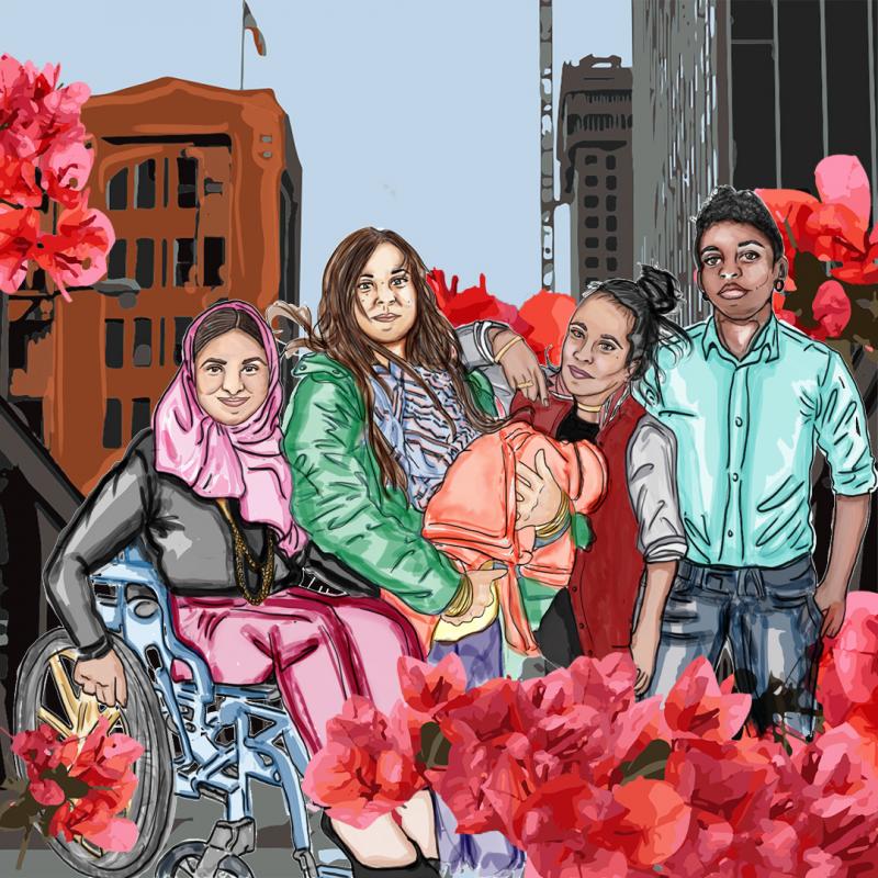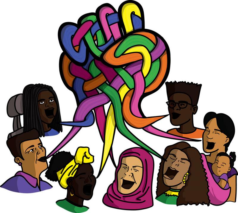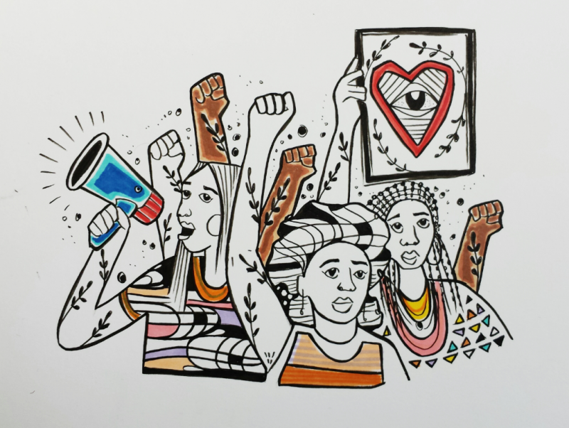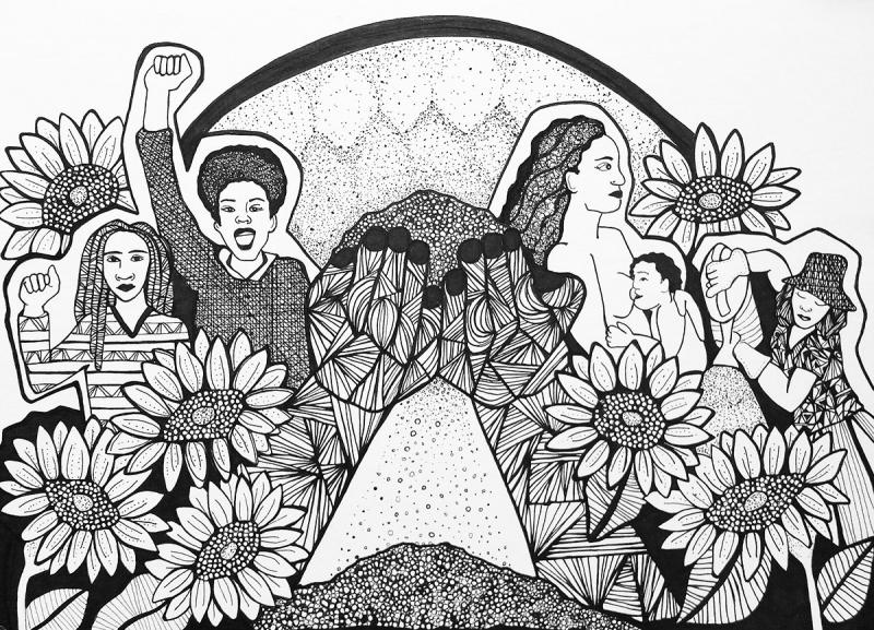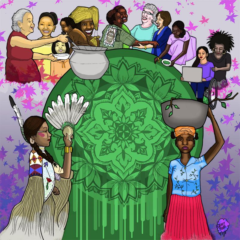 Julio Salgado depicts the translating of feminist theory into practice, over generations: the illustration represents important theories written by Black feminists, and the people that bring those theories to life.