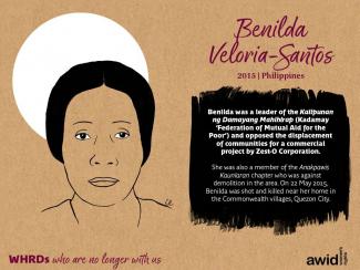 Benilda Valoria-Santos 20 November 2020 Read in: English French Spanish Category Economic, Social and Cultural Rights Region East and South East Asia Date of death / disappearance 2015 Cause of death / disappearance Killed / Asesinada / Assassinée